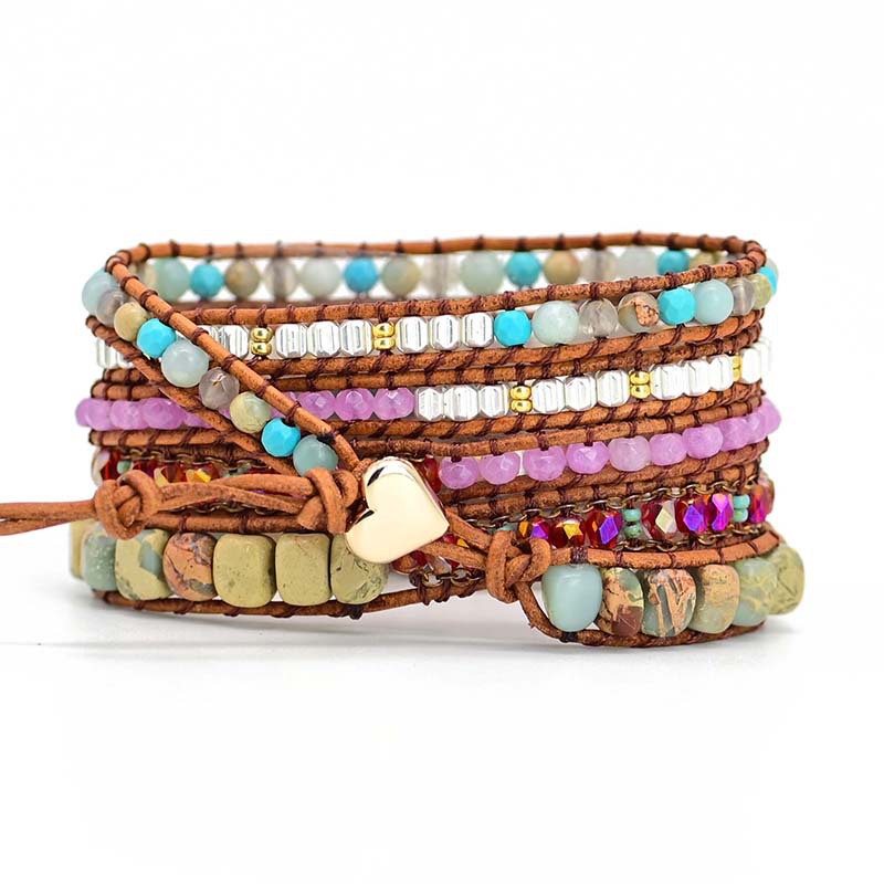 5-layer Natural Stone Crystal Metal Beads Boho Bohemian Handmade Wrapped Beaded Adjustable Bracelet with Leather Rope