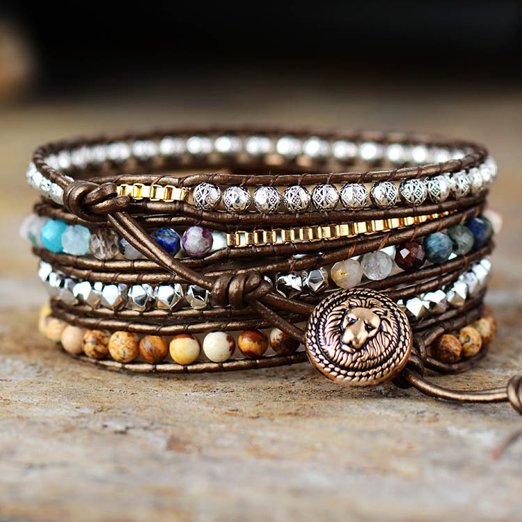5-Loop Wrapped Leather Rope Adjustable Bracelet for Women, Vintage Natural Stone Metal Beads Beaded Bracelet