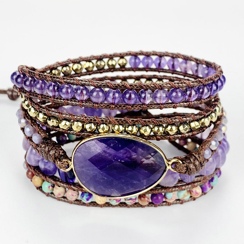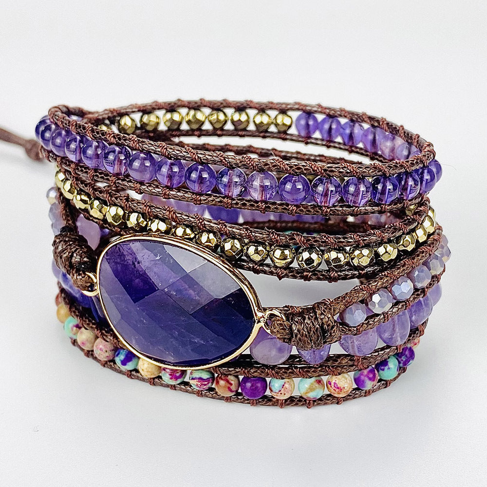 Amethyst Crystal Natural Stone Metal Mixed Beads Beaded Bracelet for Women, Bohemian Hand Woven Bracelet with Wax Rope
