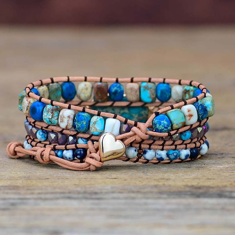 Blue Heart Natural Stone Beads Multi Layer Wrapped Handmade Beaded Bracelet for Women with Leather Rope