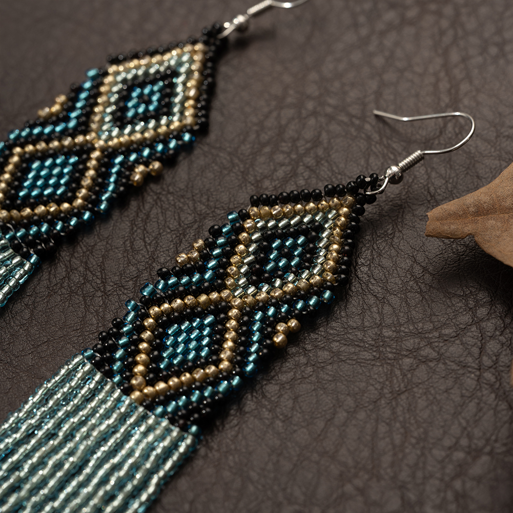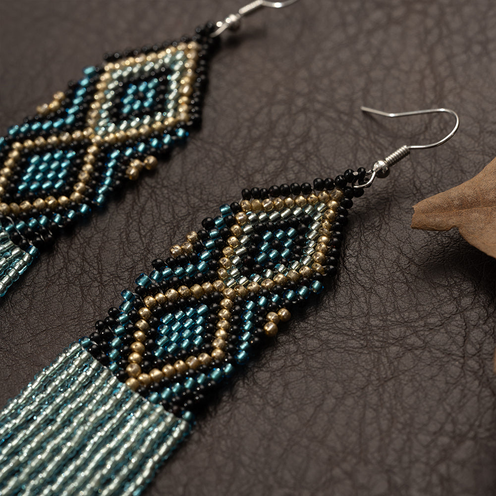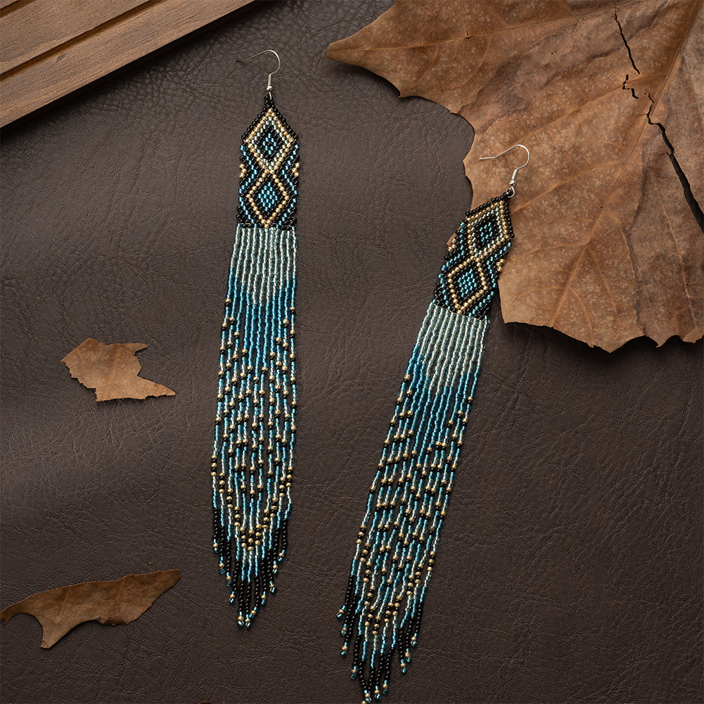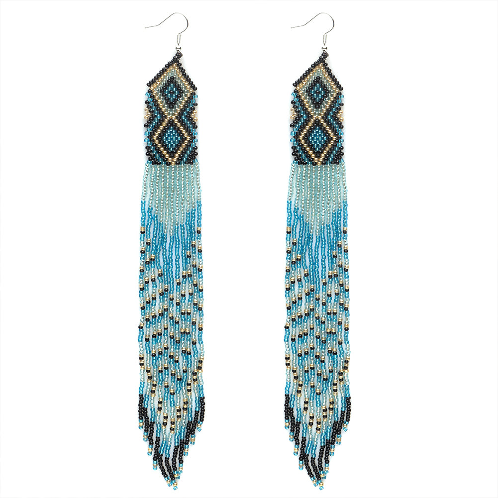 Blue Native Long Beaded Dangle Earrings for Women, Bohemian Boho Statement Handmade Long Beads Tassel Drop Earrings