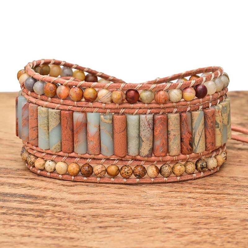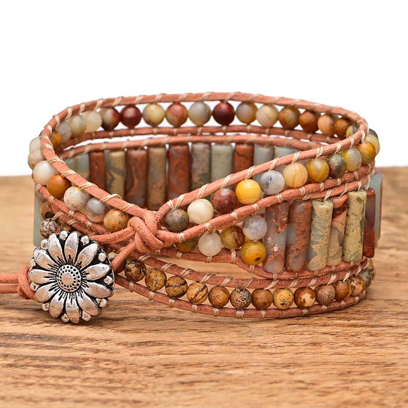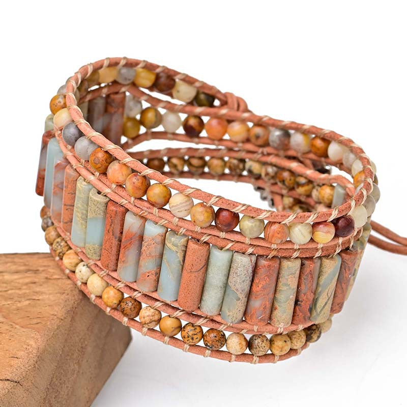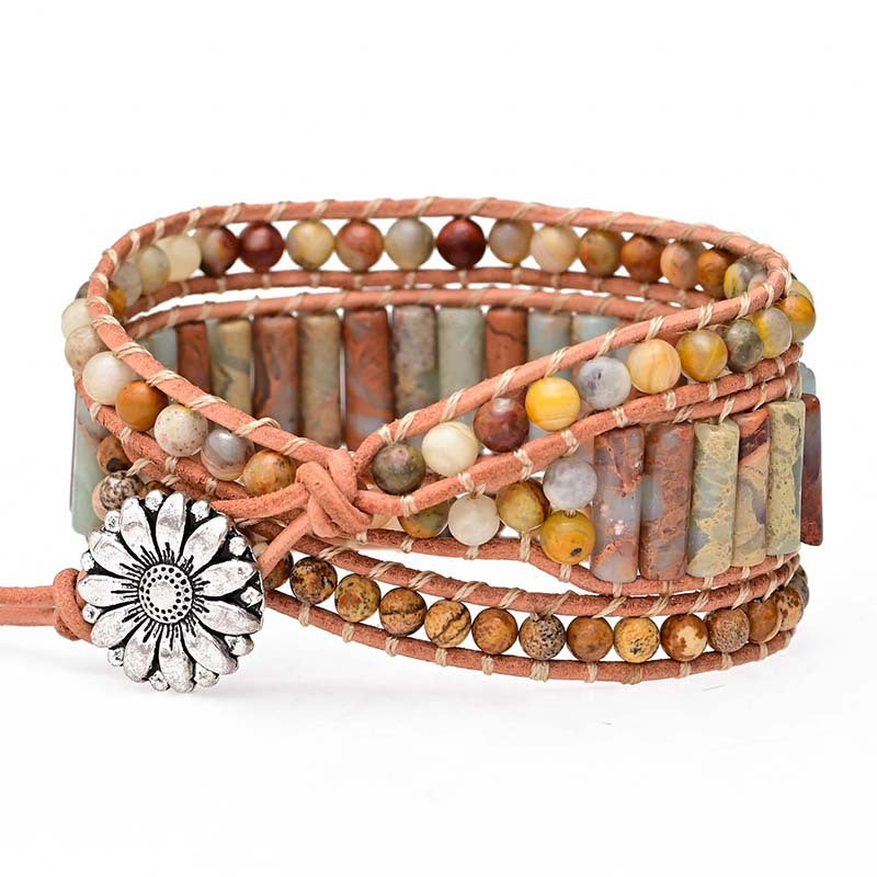 Bohemian Boho Hand Woven Natural Stone Beads Beaded Bracelet, 3-layer Winding Adjustable Bracelet for Women with Leather Rope