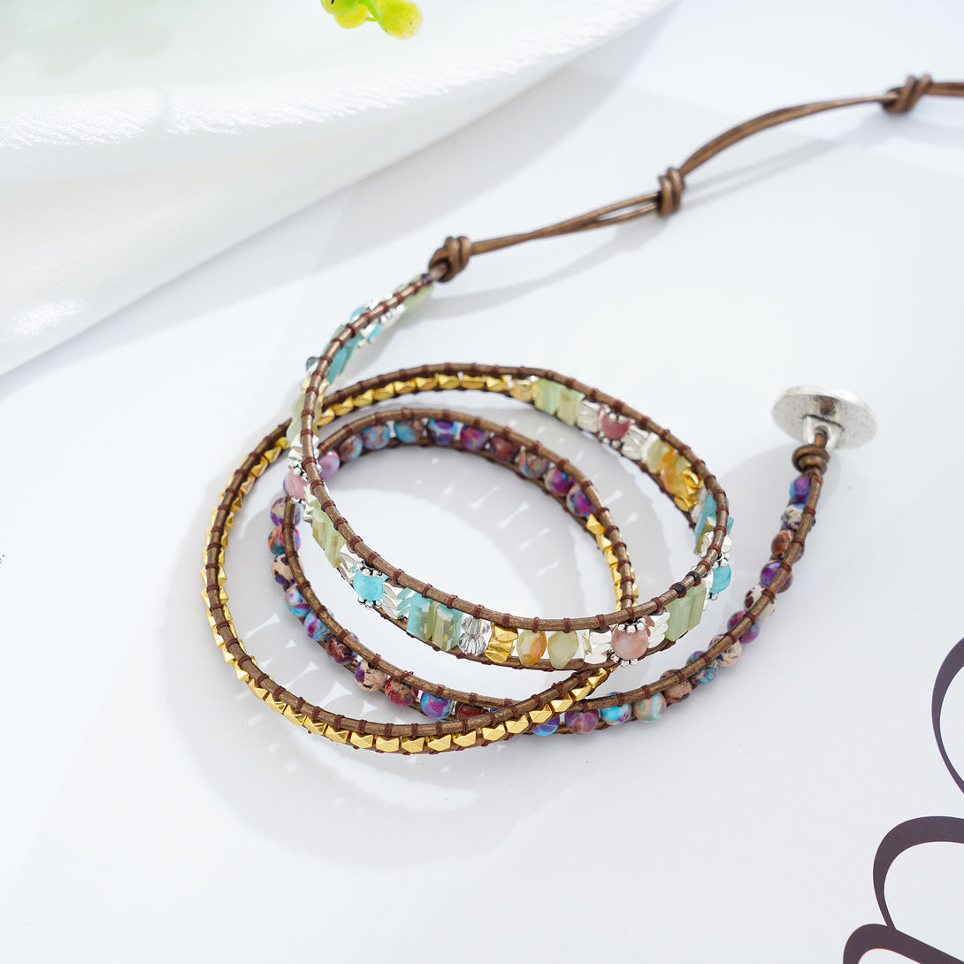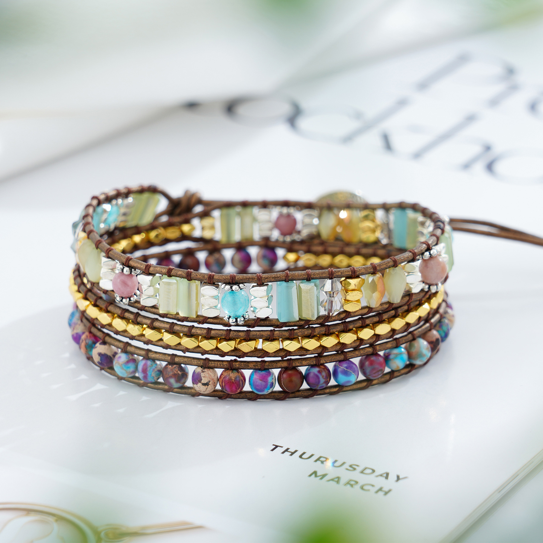 Bohemian Boho Stone Alloy Crystal Mixed Beads Beaded Bracelet for Women, Hand Woven Multi Layered Adjustable Bracelet