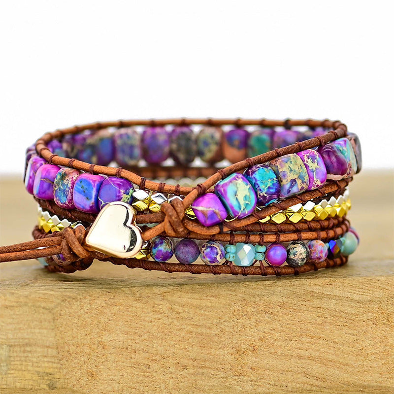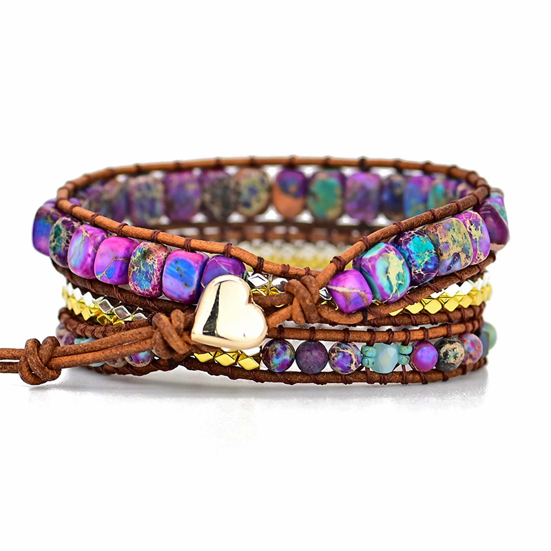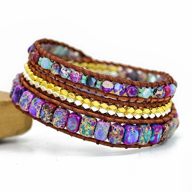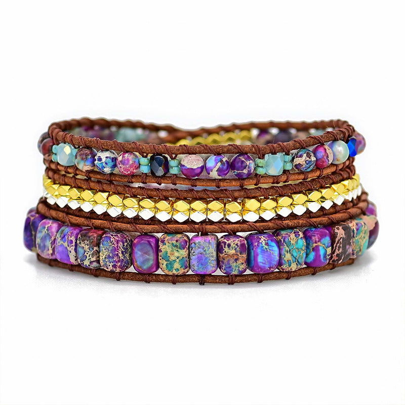 Bohemian Boho Style 3-layer Natural Stone Metal Beads Beaded Adjustable Bracelet with Leather Rope
