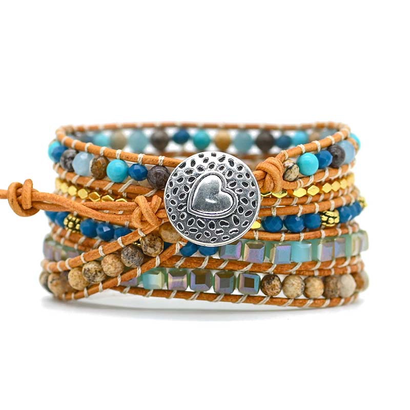 Boho Multi Layer Hand Woven Adjustable Bracelet with Leather Rope, Bohemian Crystal Alloy Natural Stone Beads Beaded Bracelet for Women