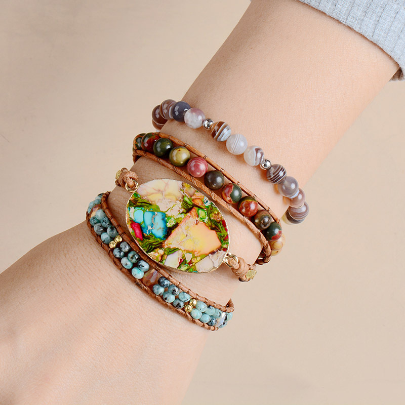 Colorful Natural Stone Beads Beaded Bracelet, Hand Woven Leather Rope Multi-layer Winding Adjustable Bracelet for Women