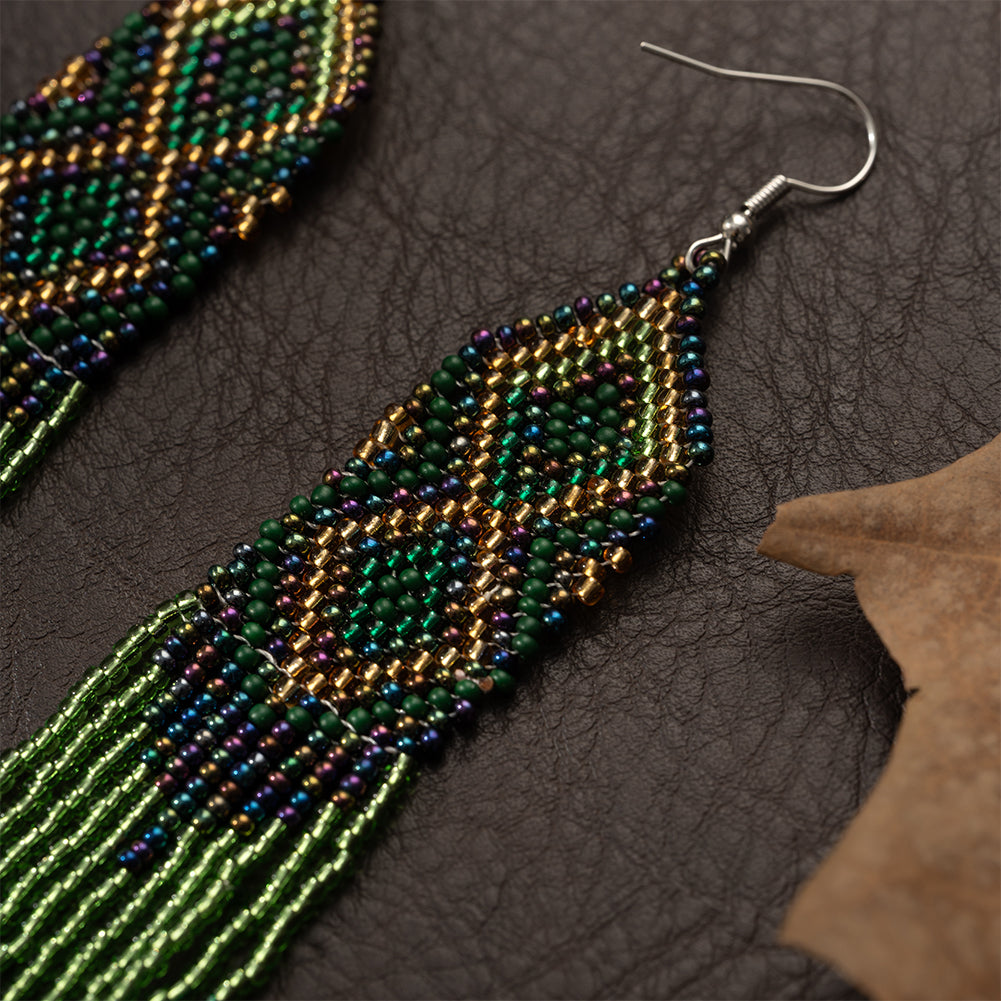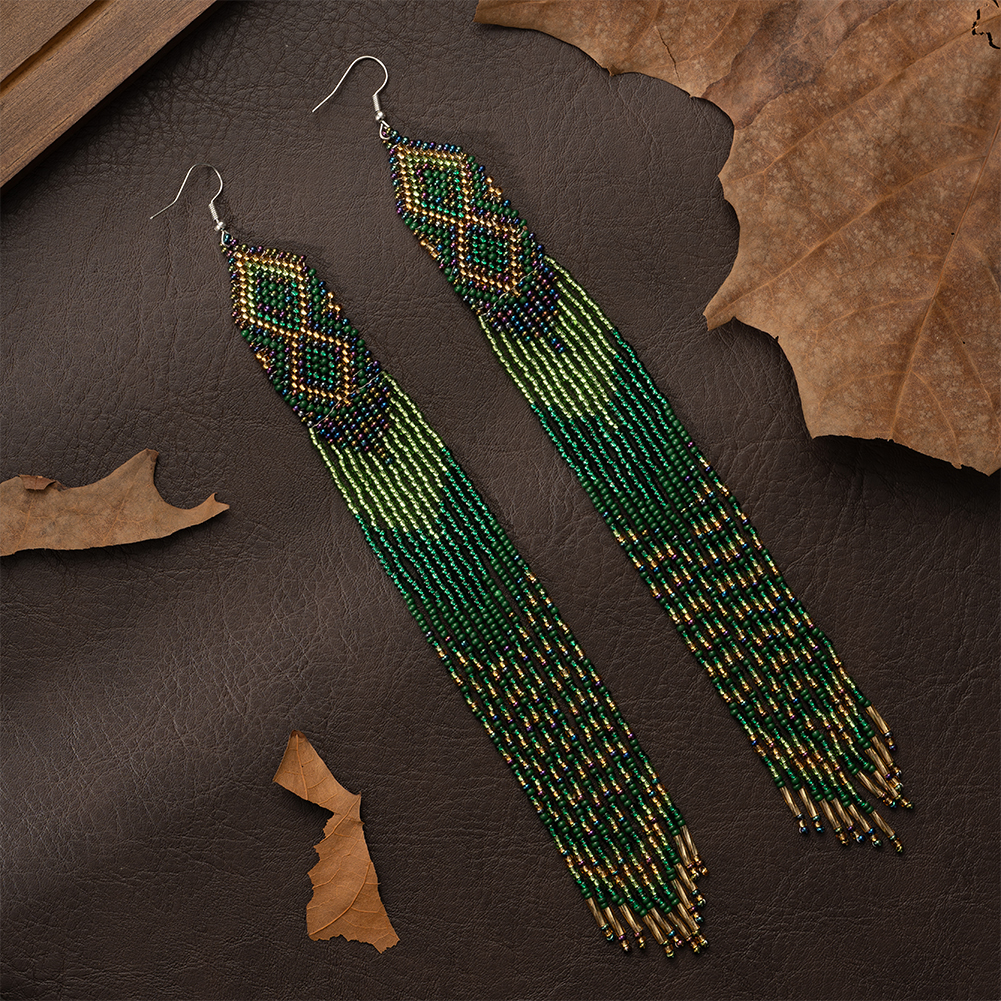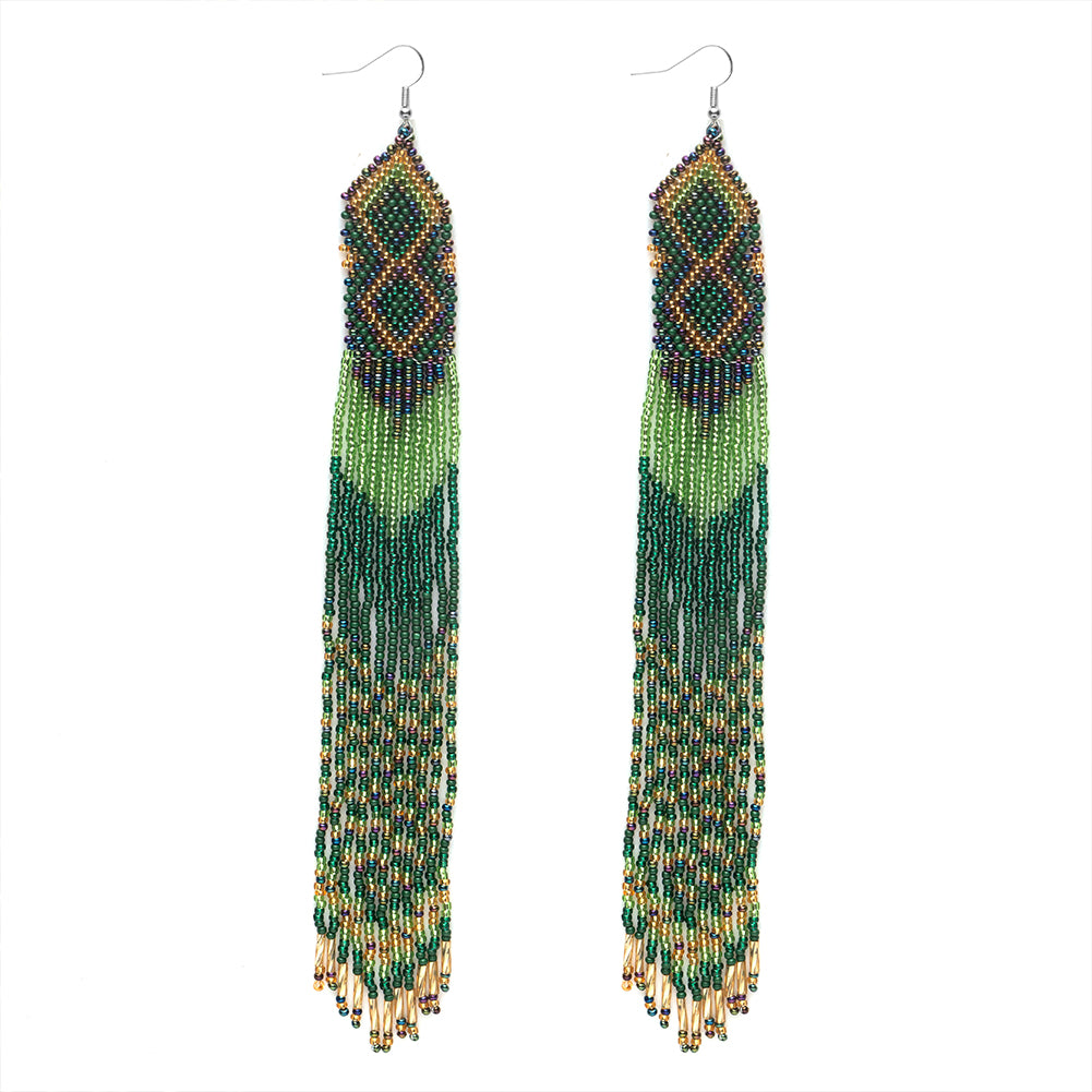 Green Native Long Beaded Dangle Earrings for Women, Bohemian Boho Statement Handmade Long Beads Tassel Drop Earrings