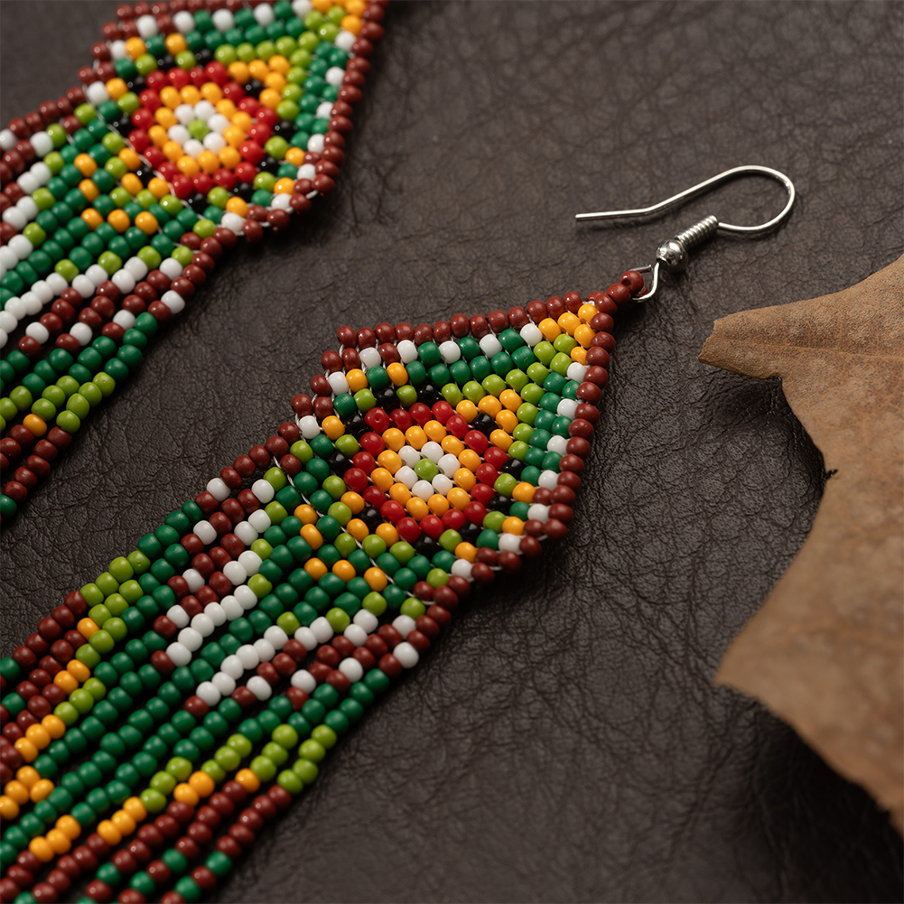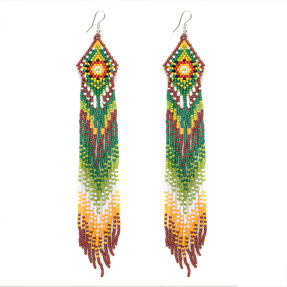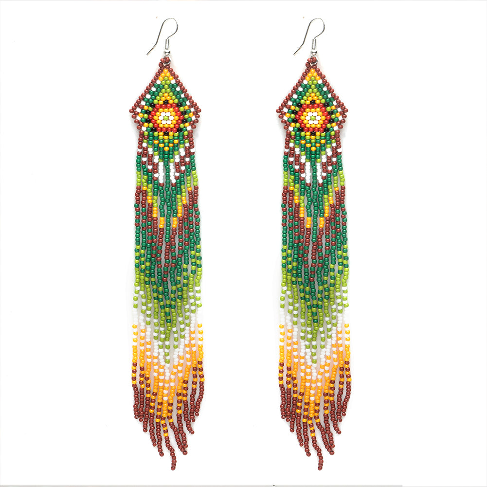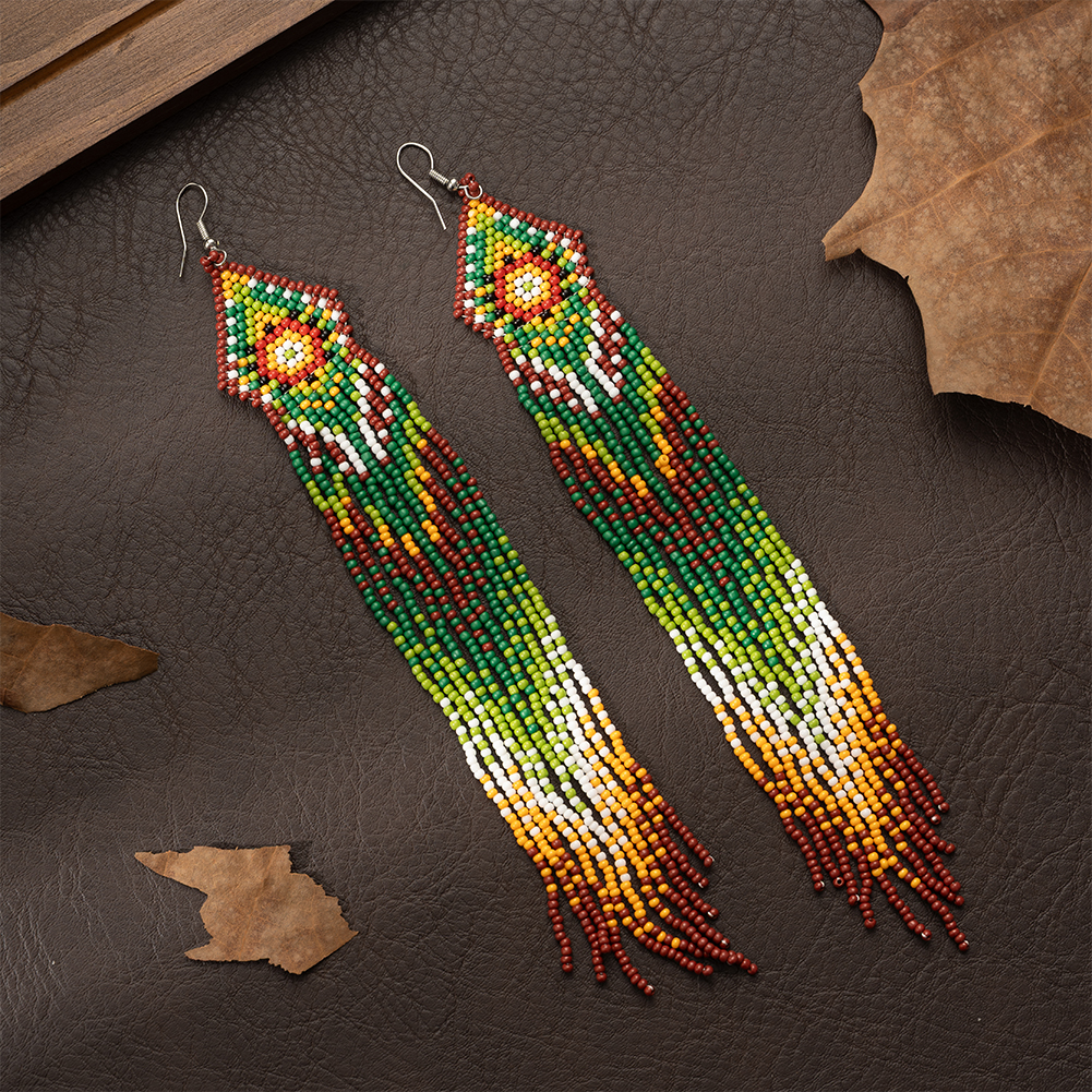 Green Native Long Beaded Dangle Earrings, Boho Statement Handmade Long Beads Tassel Drop Earrings for Women