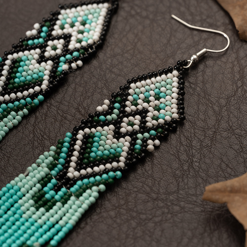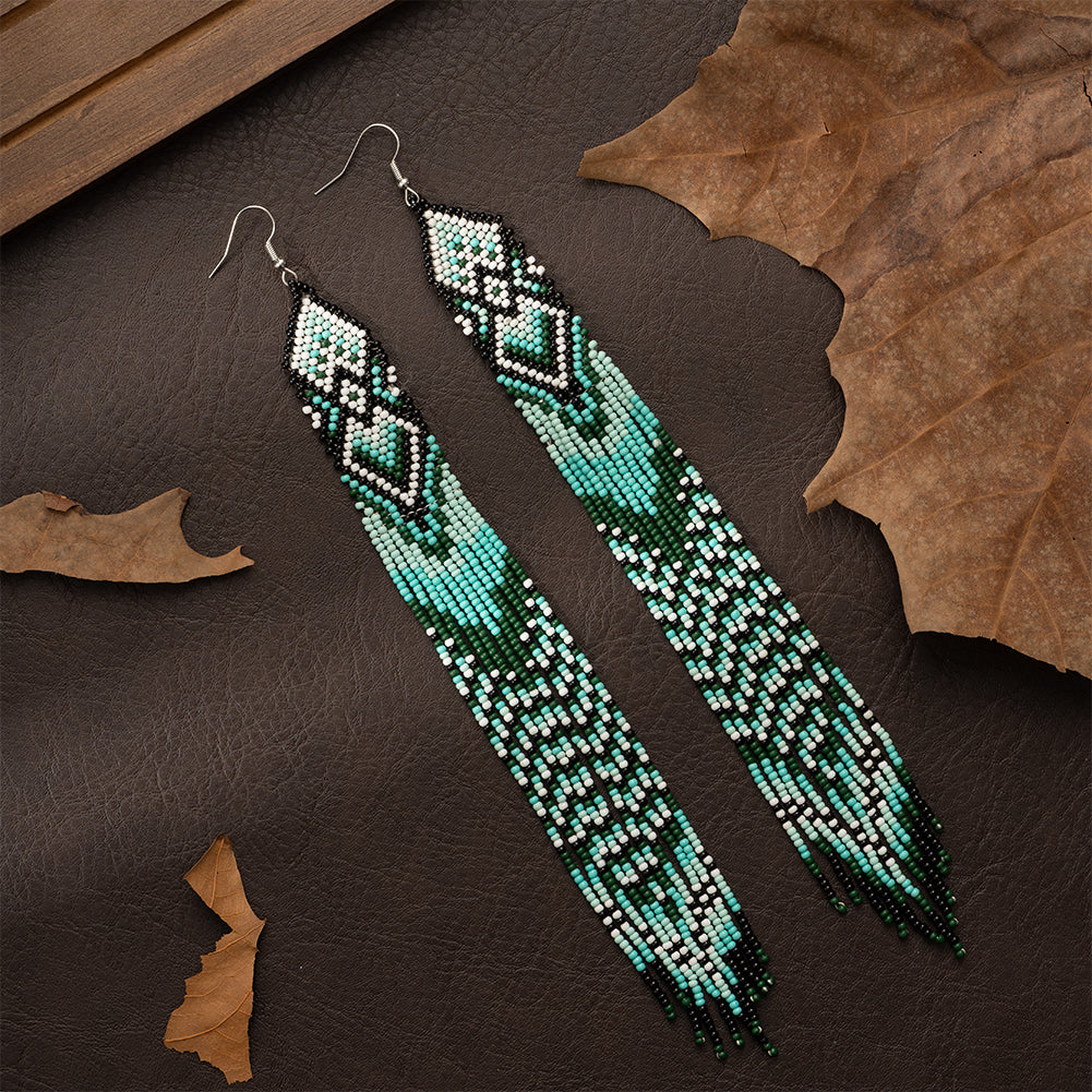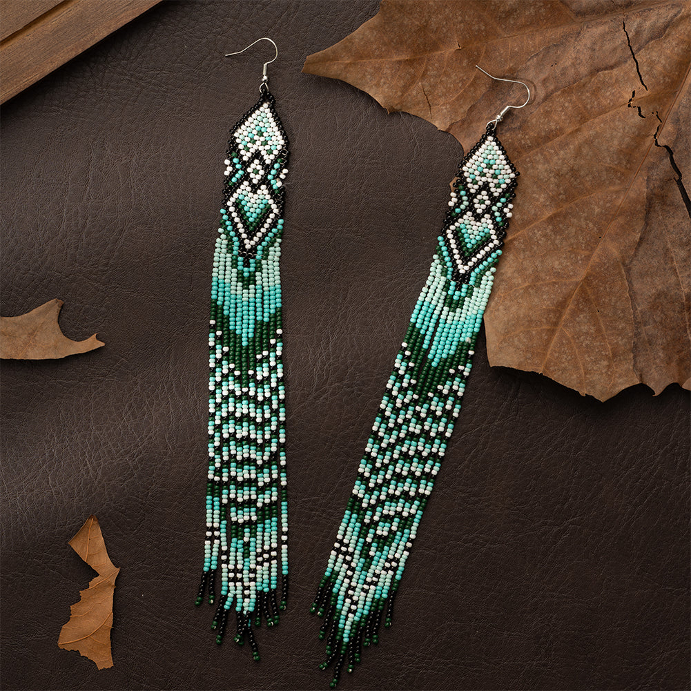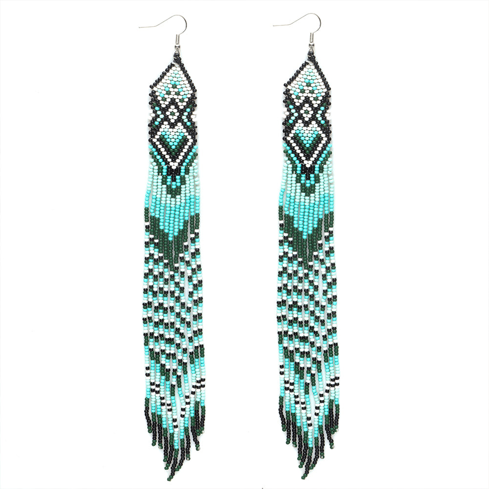 Green Native Long Beaded Dangle Earrings for Women, Bohemian Boho Statement Handmade Long Beads Tassel Drop Earrings