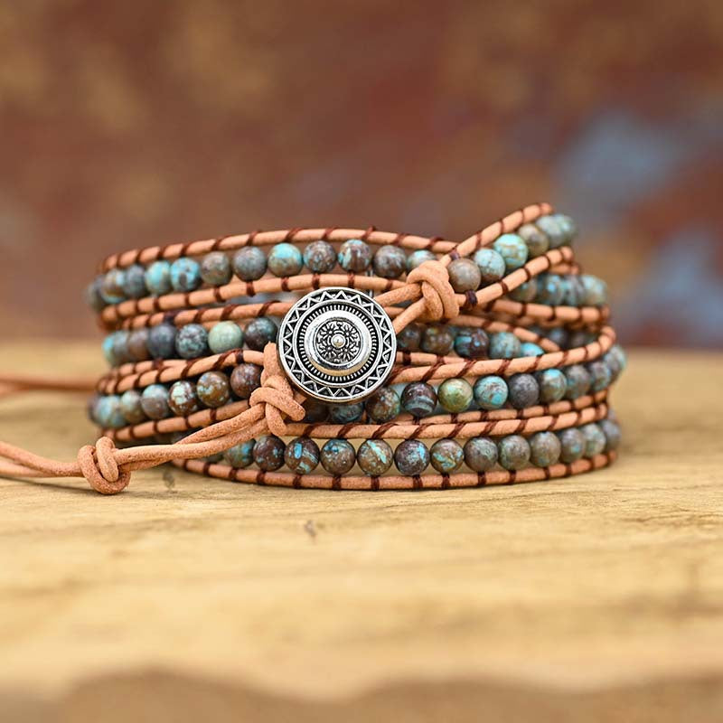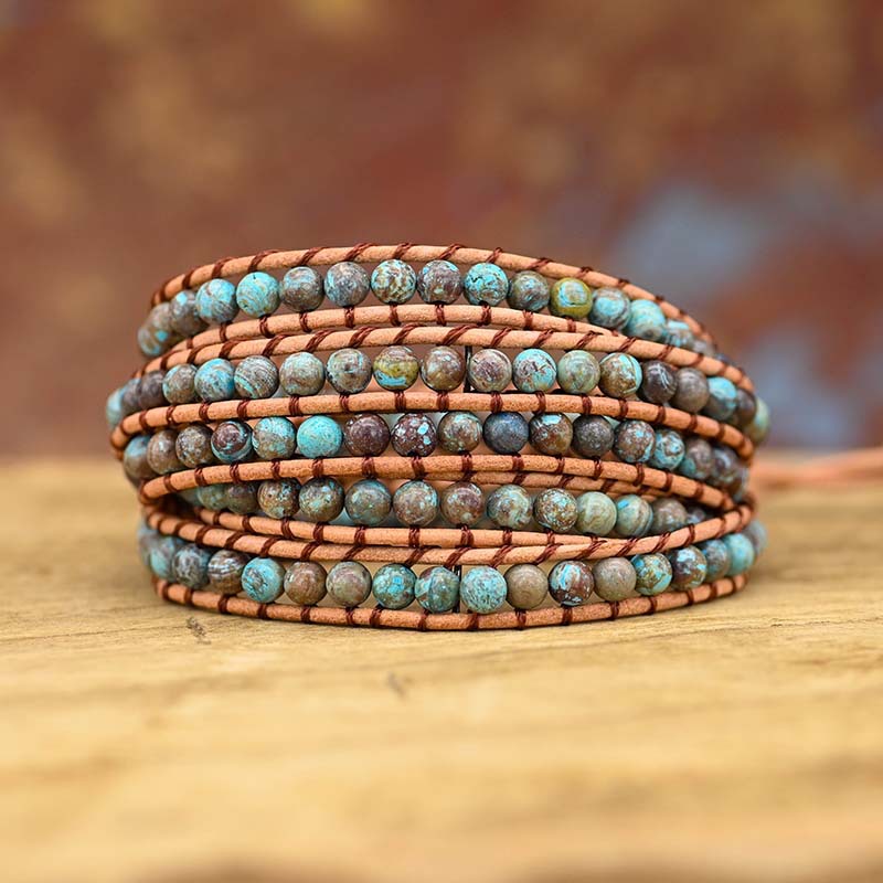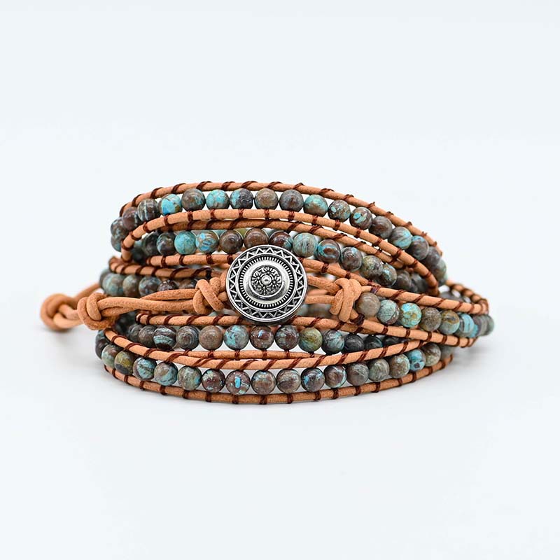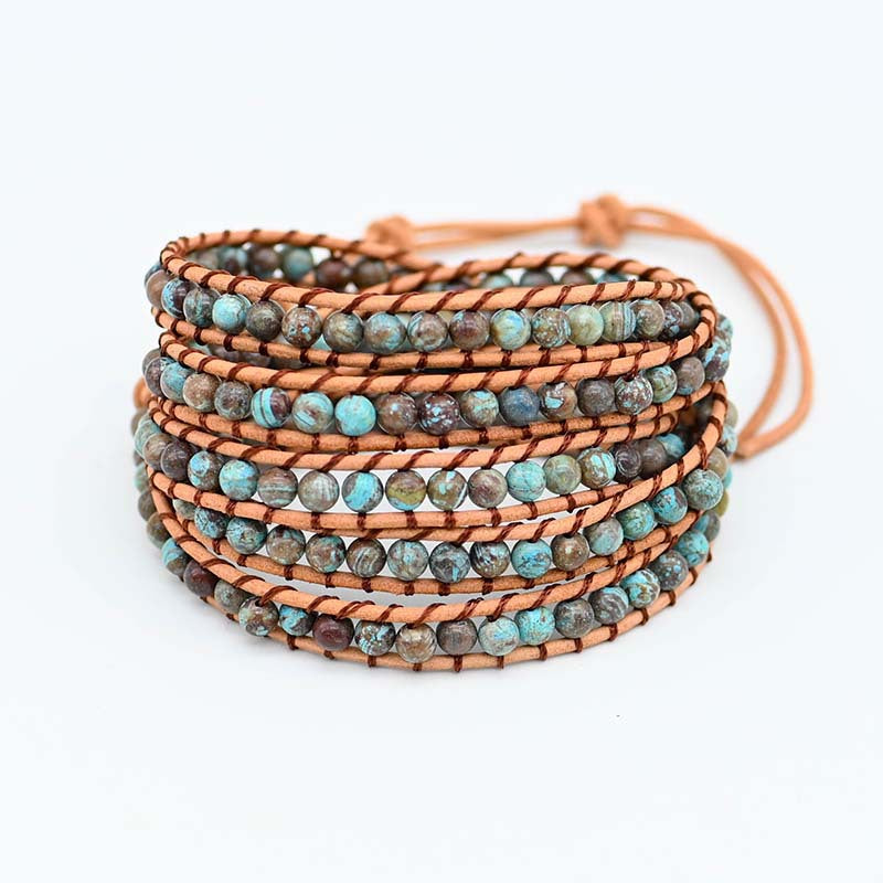 Hand Woven Natural Stone Beads Multi-layer Wrapped Bohemian Style Beaded Bracelets for Women with Leather Rope