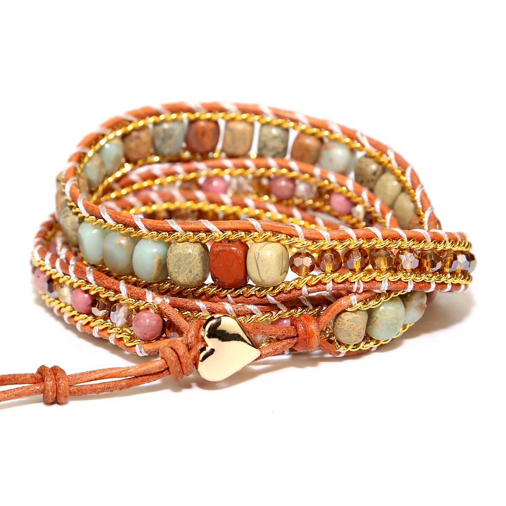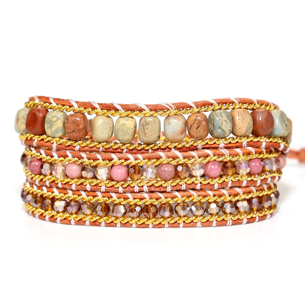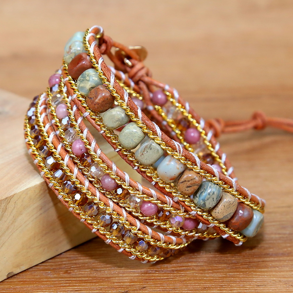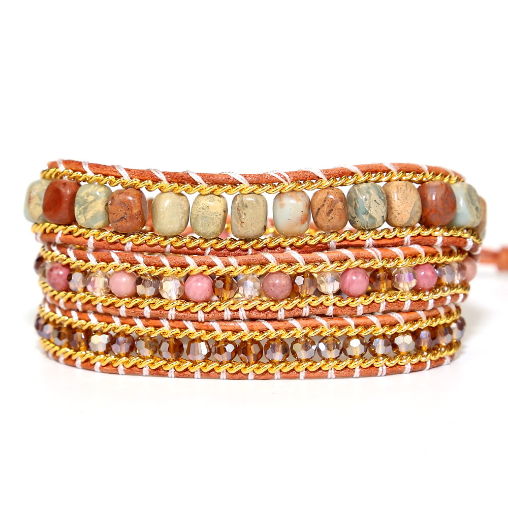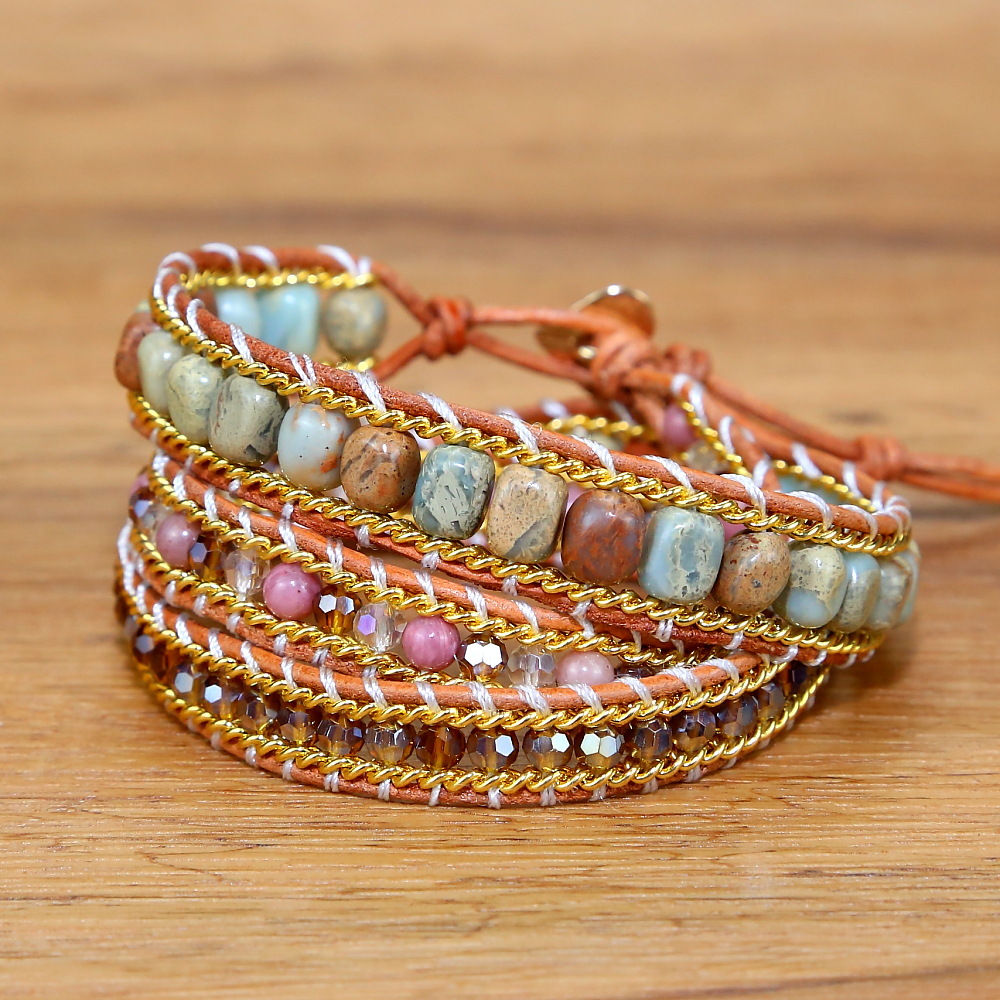 Handmade Bohemian Boho Natural Stone Crystal Mixed Beads Weaving Beaded Adjustable Bracelets for Women with Leather Rope