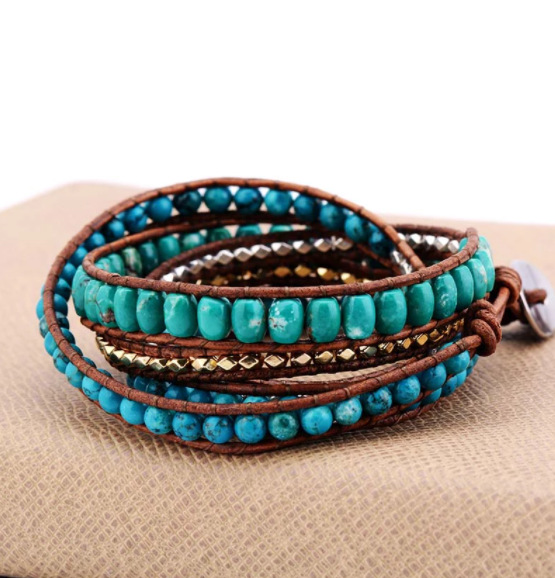 Handmade Bohemian Boho Retro Turquoise Stone Metal Beads Multi-layer Winding Beaded Adjustable Bracelet for Women