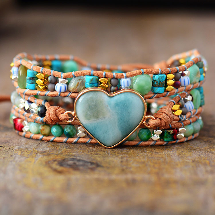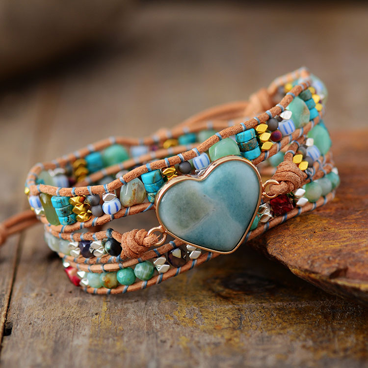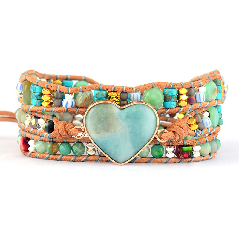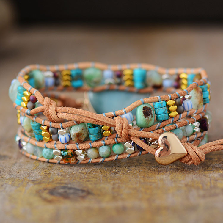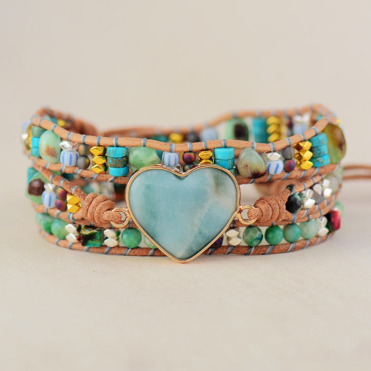 Heart Natural Stone Beads Beaded Bracelet for Women, Bohemian Boho Style Leather Rope Woven Adjustable Bracelet