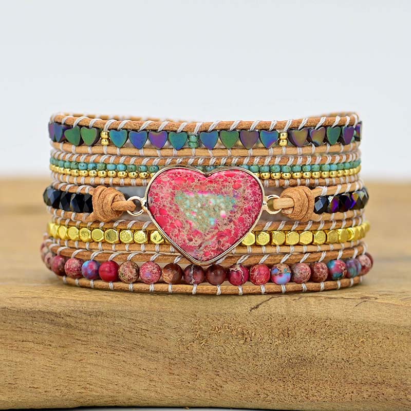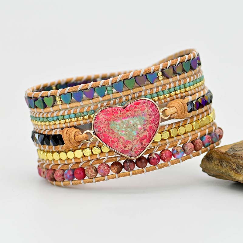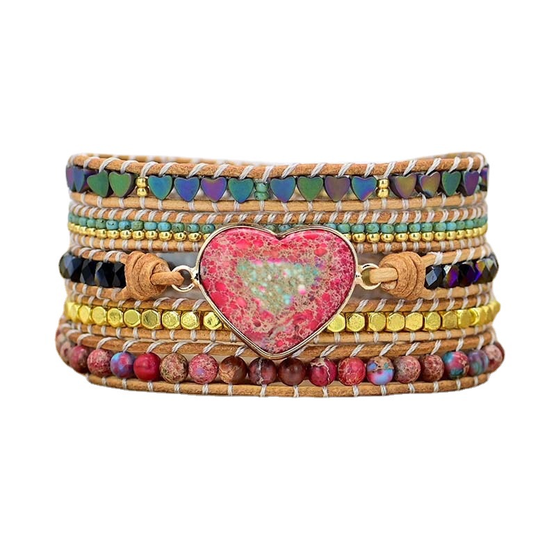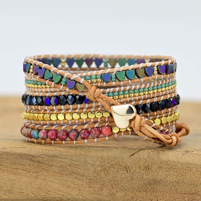 Love Heart Natural Stone and Metal Beads Mixed Beaded Bracelet, Bohemian Boho Multi-layer Weaving Leather Rope Adjustable Bracelet for Women