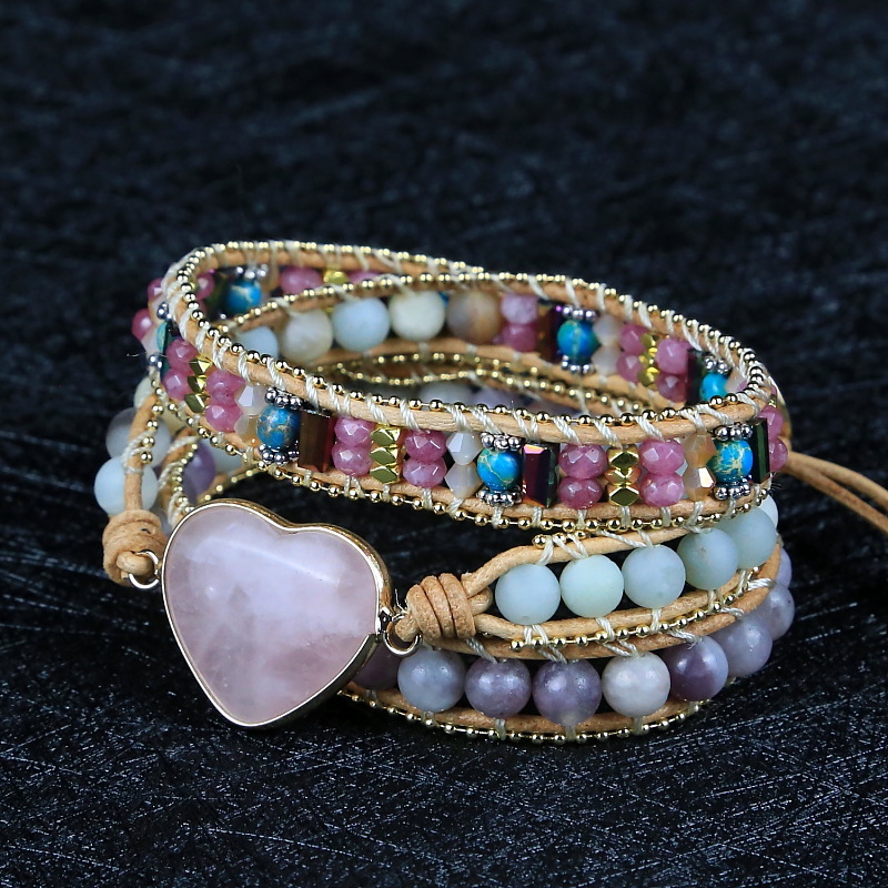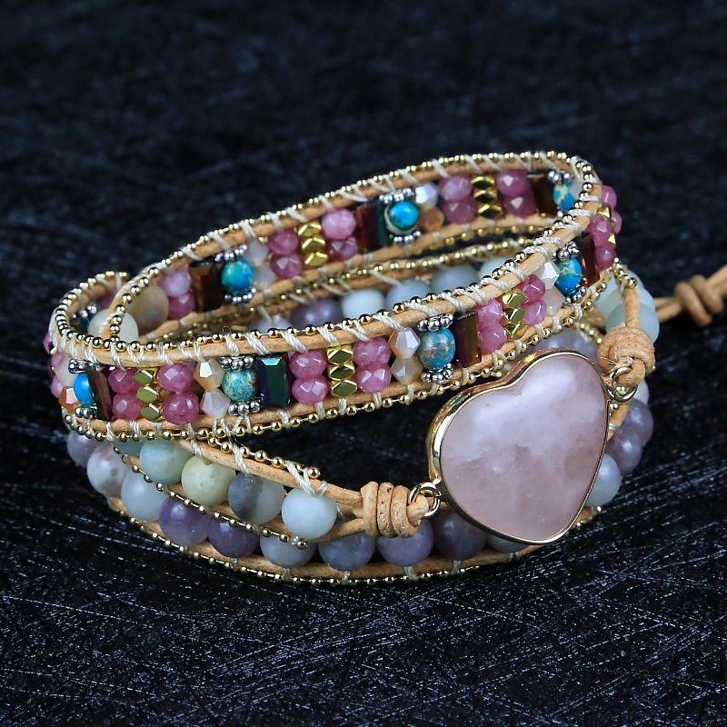 Pink Heart Crystal Natural Stone Beads Beaded Bracelet, Hand Woven Bohemian Boho Multi-layer Leather Rope Bracelet for Women