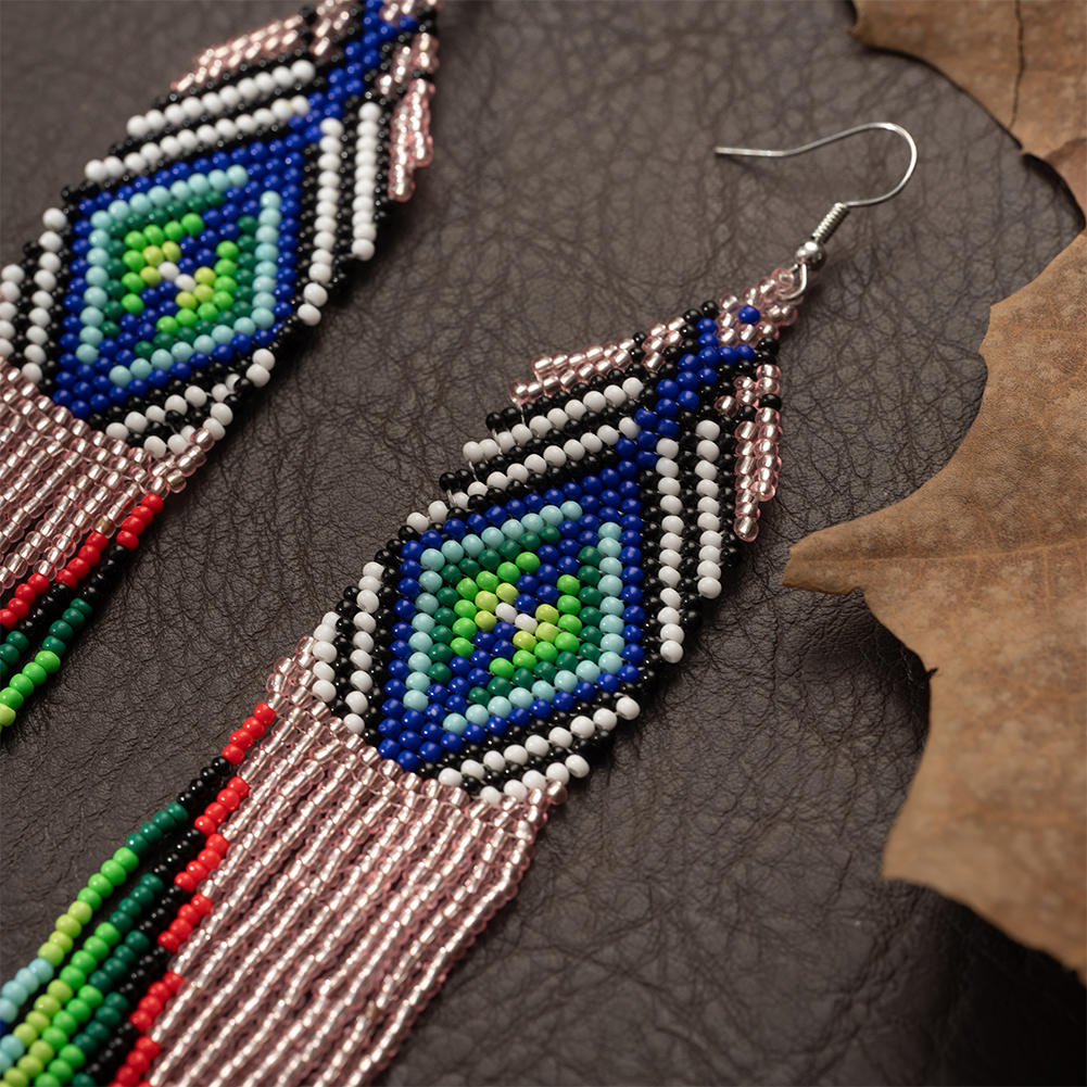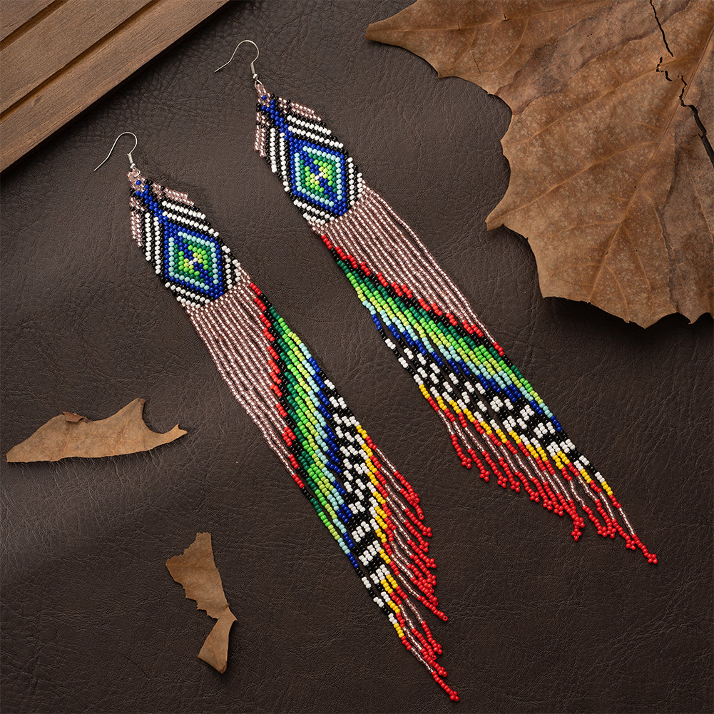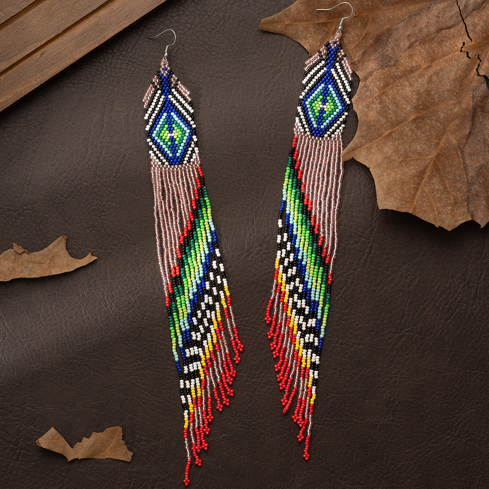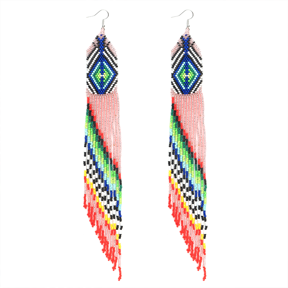 Pink Native Long Beaded Dangle Earrings for Women, Boho Statement Handmade Long Beads Tassel Drop Earrings