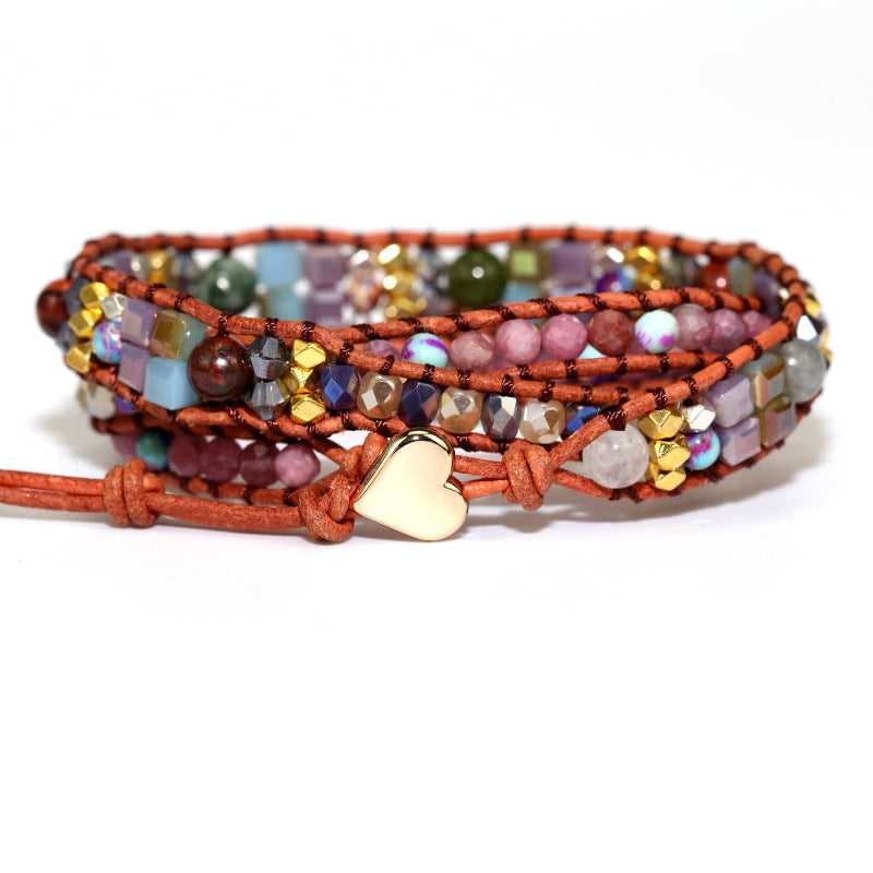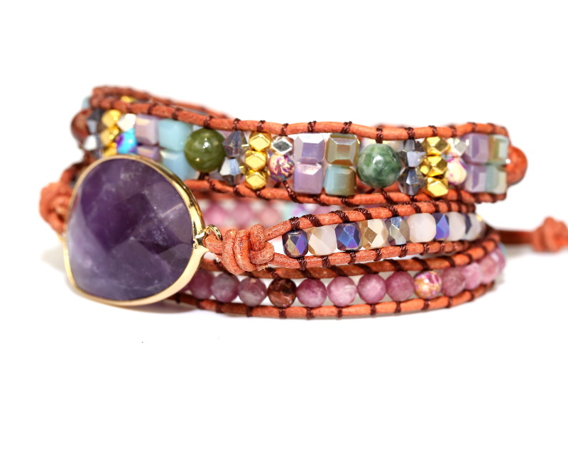 Purple Crystal Natural Stone Beads Beaded Bracelet for Women, Bohemian Boho Multilayer Hand Woven Adjustable Bracelet