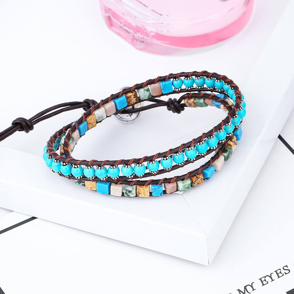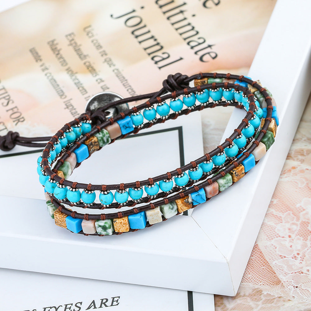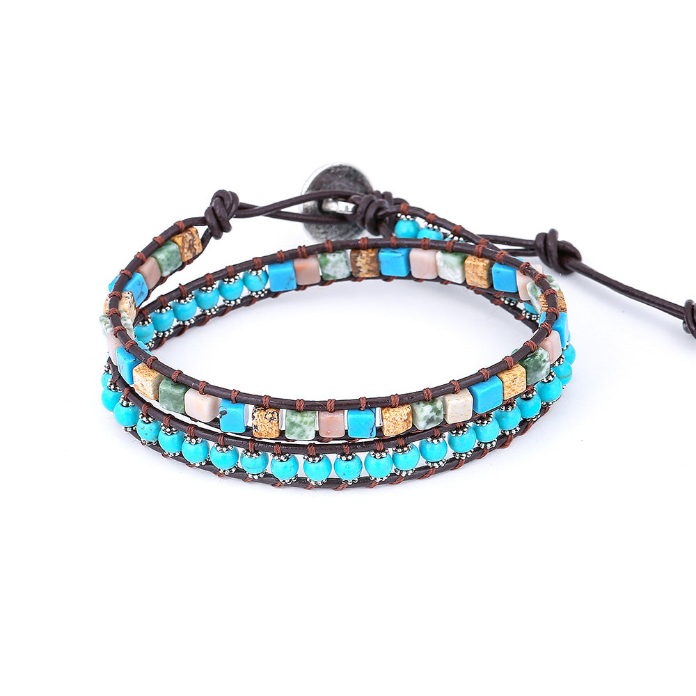 Turquoise Stone Beads Beaded Bracelet for Women, Hand Woven Double Layered Winding Vintage Bohemian Boho Adjustable Bracelet