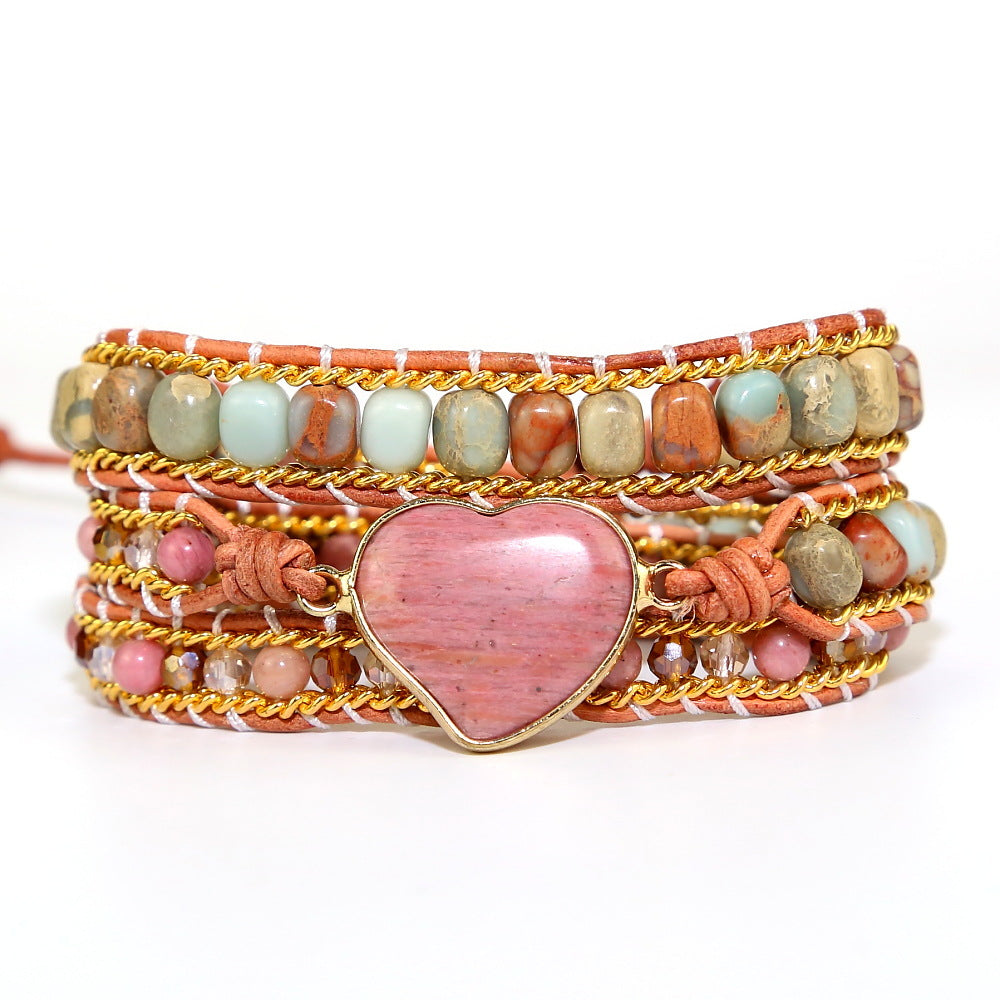 Vintage Heart Natural Stone Beads Beaded Bracelets, Bohemian Boho Multilayer Adjustable Bracelets for Women with Leather Rope