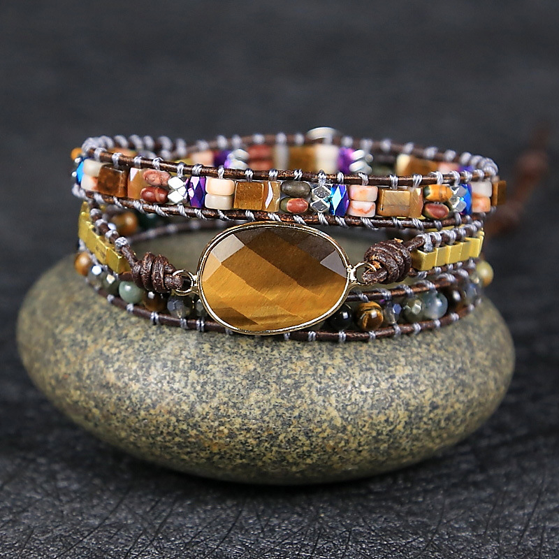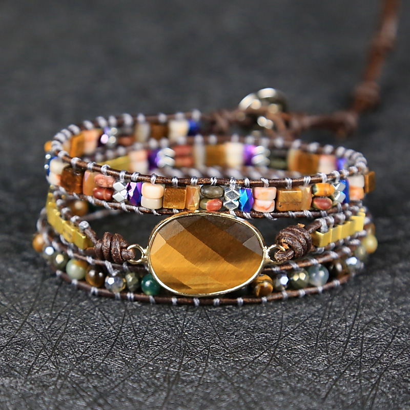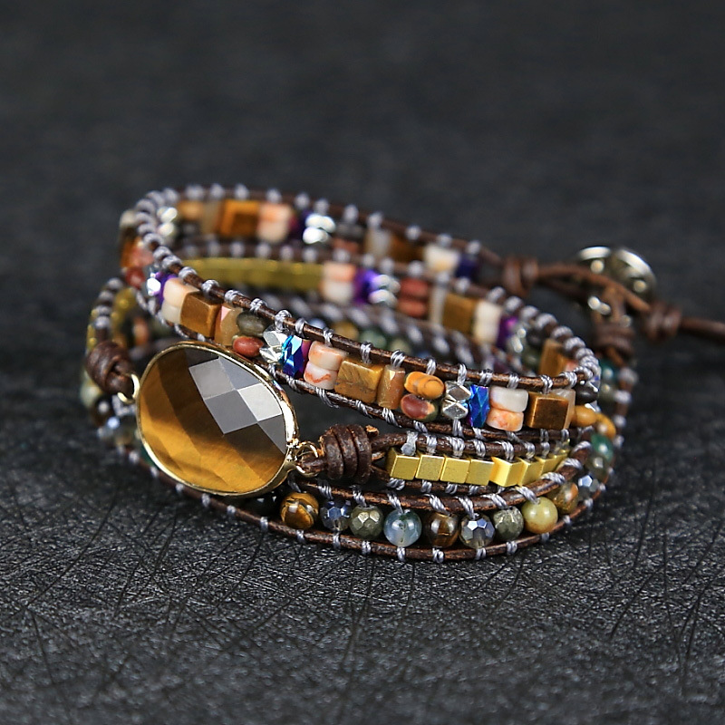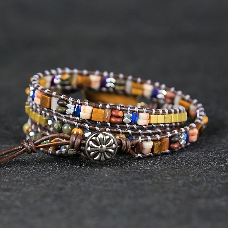 Vintage Multi Layer Beaded Bracelets for Women, Natural Stone Crystal Metal Mixed Beads Weaving Adjustable Bracelet with Leather Rope