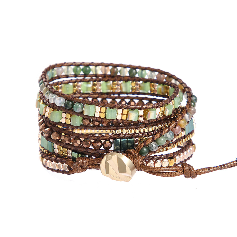Vintage Stone Crystal Metal Mixed Beads Beaded Bracelet for Women, Weaving Handmade Bohemian Boho Adjustable Bracelet with Leather Rope