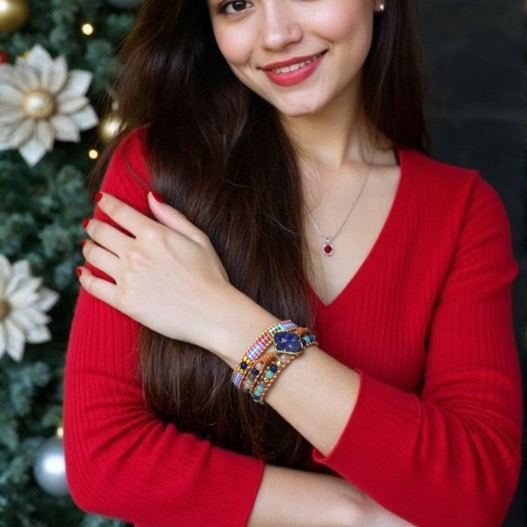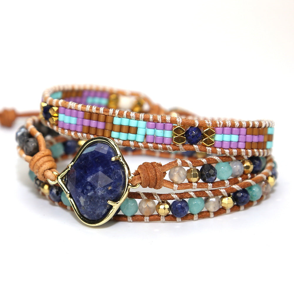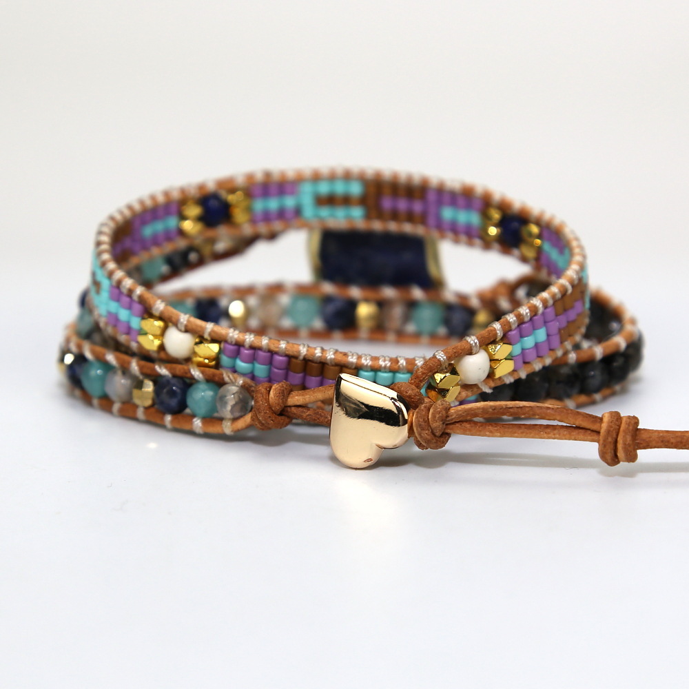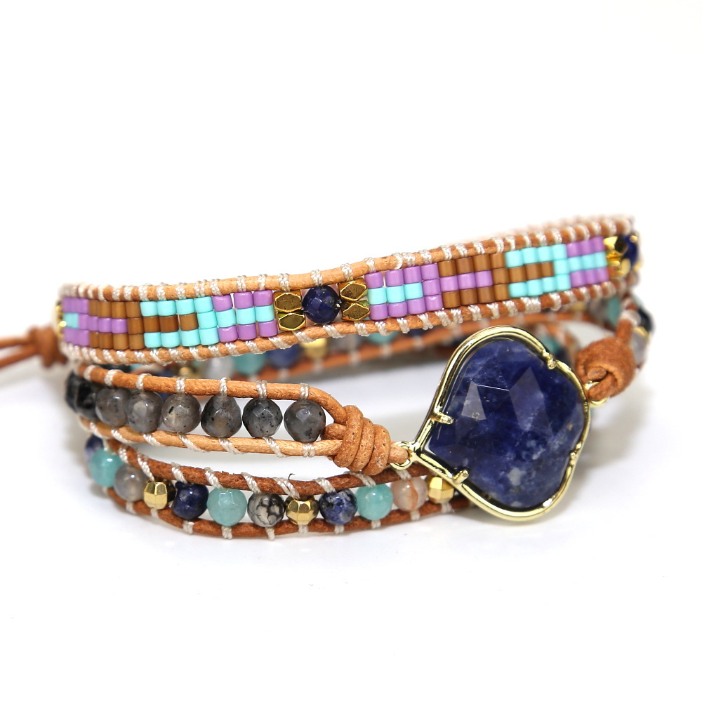 Vintage Style Natural Stone and Glass Seed Beads Beaded Bracelet for Women, Multi-layer Leather Rope Handmade Woven Bohemian Boho Adjustable Bracelet