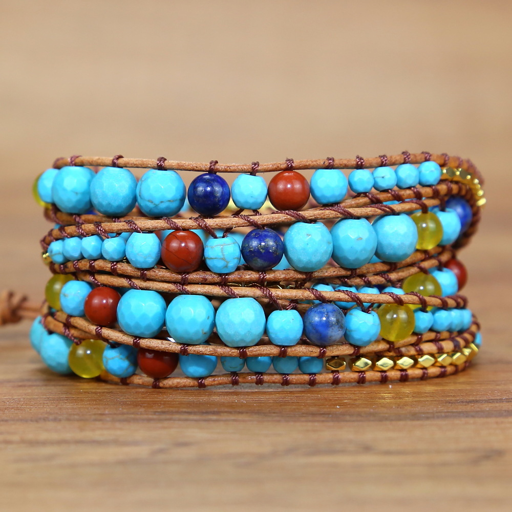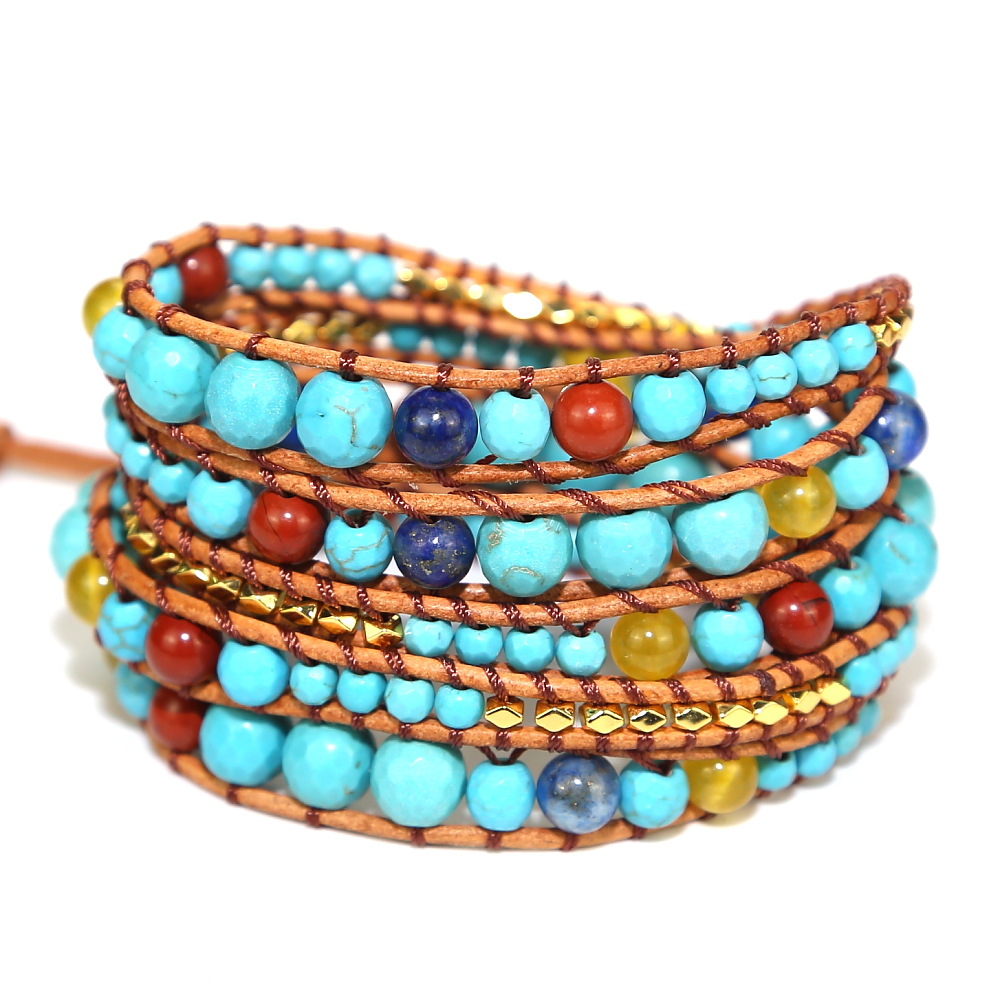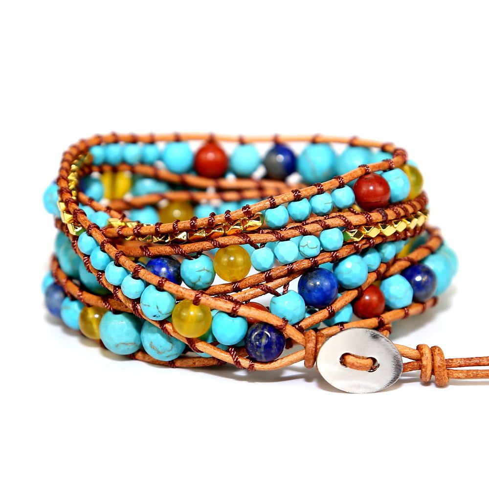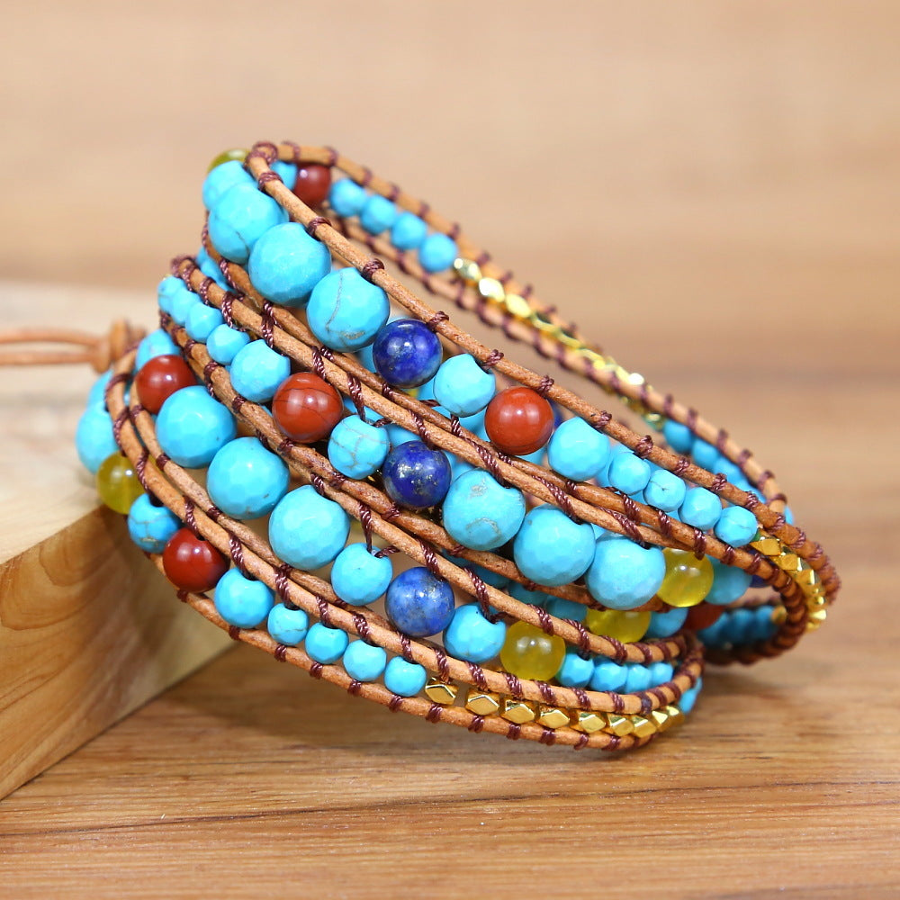 Vintage Turquoise Stone Beads Beaded Bracelet, Handmade Woven Bohemian Boho Multilayer Adjustable Bracelet for Women